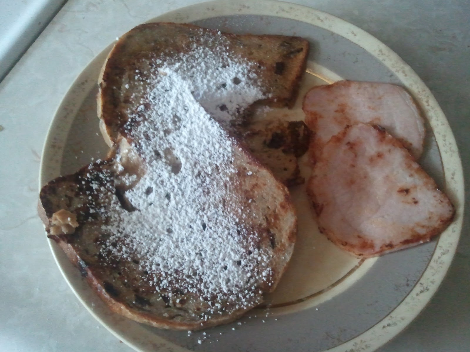 In fact, this would have been an amazing idea in practice if I hadn't ruined my loaf of raisin bread. I think my breadmaker hates me; it over-rises white bread and under-rises raisin bread.