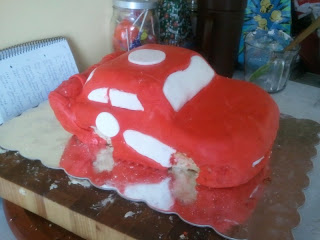 Just as a note: this is supposed to be the Lightning McQueen at the very very end of the movie when he shows up with his racing mixed with Radiator Springs paint job. It's probably an easier design than his standard paint job but not too basic. I'm sure the kids will know who the cake is supposed to be :P