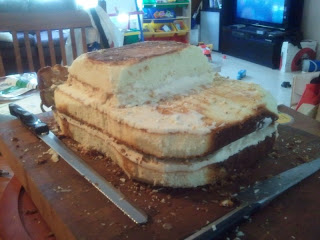 So, anyway, I brought the cakes to the dining room table and held my breath as I carved it. Little pieces, bit by bit, until it looked just right.