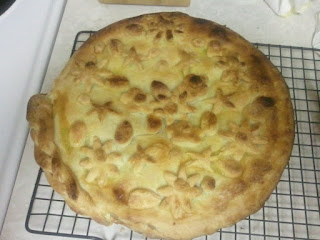 I made some dough from scratch -- a deep dish pate brisee dough, and then made a deep dish apple pie which was flambeed in brandy. When it was finished, I cut pieces of dough out with the cookie cutter and glazed it all in egg yolk. Sadly, the braid around the border of the crust fell off because I was stupid and didn't glaze before placing. Herp derp. At least it still looks nice.
