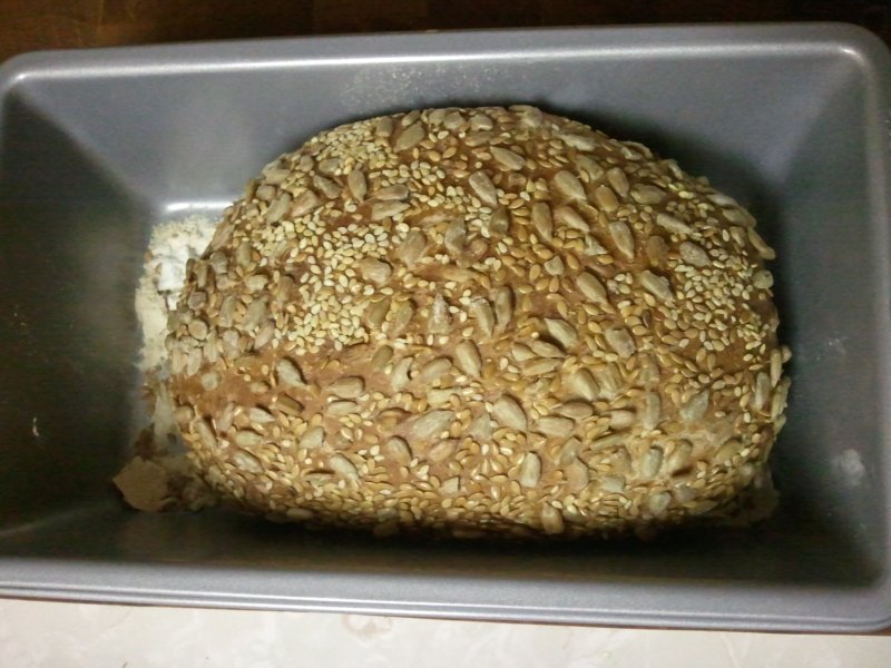 When the dough was finished mixing in the breadmaker I allowed it to rise for a few hours and then rolled it in seeds for a beautiful roasted crust.