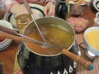 We went to Rob and Cindy's place last weekend for another fondue party. We started it all with the dessert fondue party we had on new years and they decided to step it up a notch and do a meat fondue.