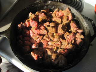 First modification is I browned the beef in a pan with some olive oil before I added it to the slow cooker. Second modification is I added more veggies than it called for. Third modification is I waited until halfway through the cooking time before I added the vegetables so it wouldn't be mushy.